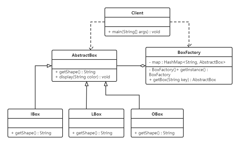 提供了一个工厂类(BoxFactory),用来管理享元对象(也就是AbstractBox子类对象),该工厂类对象只需要一个,所以可以使用单例模式。并给工厂类提供一个获取形状的方法。