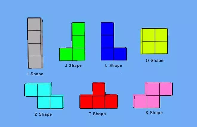 下面的图片是众所周知的俄罗斯方块中的一个个方块,如果在俄罗斯方块这个游戏中,每个不同的方块都是一个实例对象,这些对象就要占用很多的内存空间,下面利用享元模式进行实现。