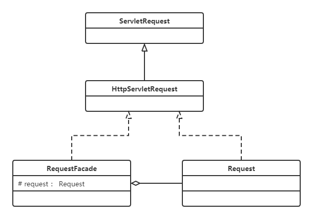 定义 RequestFacade 类,分别实现 ServletRequest ,同时定义私有成员变量 Request ,并且方法的实现调用 Request 的实现。然后,将 RequestFacade上转为 ServletRequest 传给 servlet 的 service 方法,这样即使在 servlet 中被下转为 RequestFacade ,也不能访问私有成员变量对象中的方法。既用了 Request ,又能防止其中方法被不合理的访问。