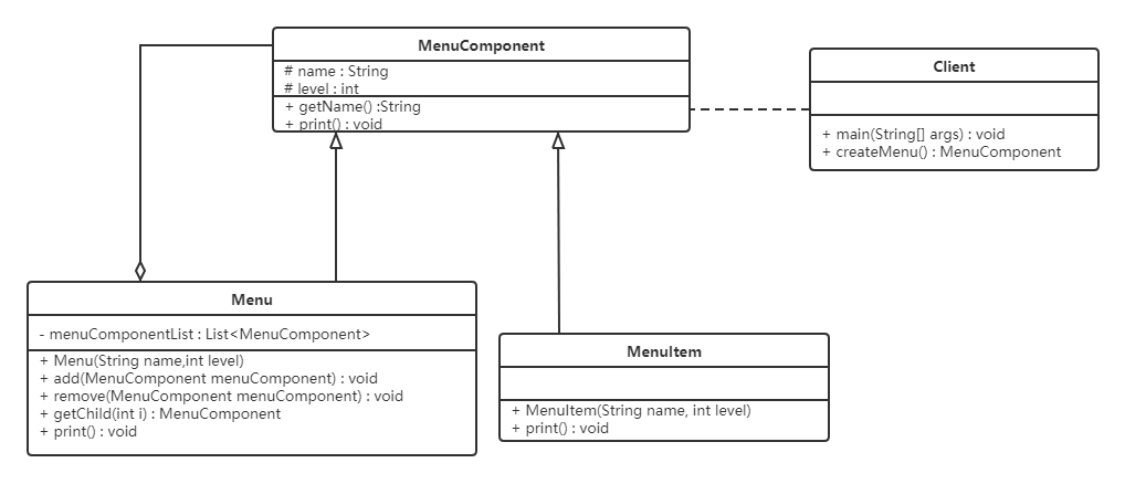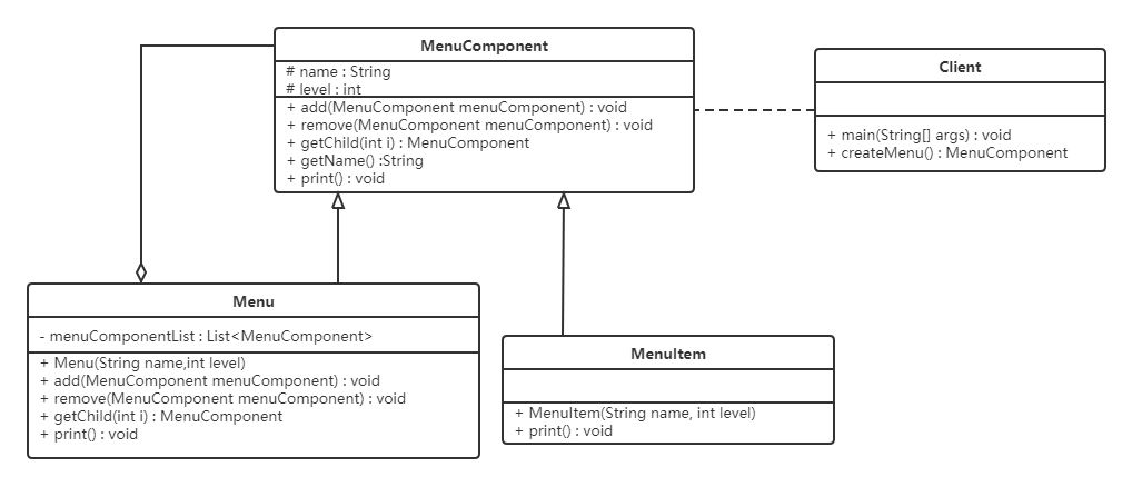 不管是菜单还是菜单项,都应该继承自统一的接口,这里姑且将这个统一的接口称为菜单组件。