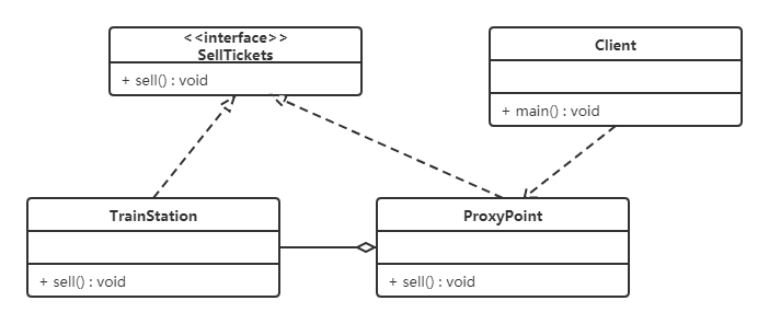 如果要买火车票的话,需要去火车站买票,坐车到火车站,排队等一系列的操作,显然比较麻烦。而火车站在多个地方都有代售点,我们去代售点买票就方便很多了。这个例子其实就是典型的代理模式,火车站是目标对象,代售点是代理对象。类图如下: