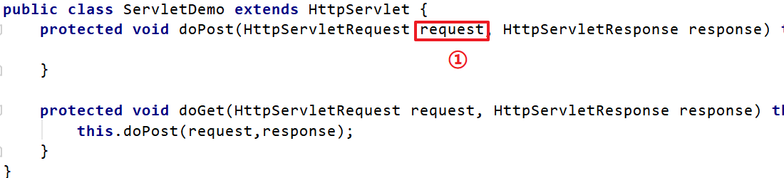 使用tomcat作为web容器时,接收浏览器发送过来的请求,tomcat会将请求信息封装成ServletRequest对象,如下图①处对象。但是大家想想ServletRequest是一个接口,它还有一个子接口HttpServletRequest,而我们知道该request对象肯定是一个HttpServletRequest对象的子实现类对象,到底是哪个类的对象呢?可以通过输出request对象,我们就会发现是一个名为RequestFacade的类的对象。