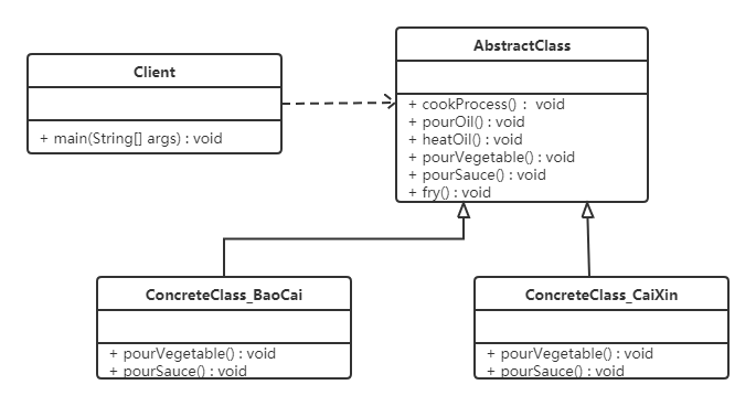 炒菜的步骤是固定的,分为倒油、热油、倒蔬菜、倒调料品、翻炒等步骤。现通过模板方法模式来用代码模拟。类图如下: