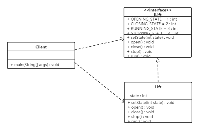 1 2 3 4 5 6 7 8 9 10 11 12 13 14 15 16 17 18 19 20 21 22 23 24 25 26 27 28 29 30 31 32 33 34 35 36 37 38 39 40 41 42 43 44 45 46 47 48 49 50 51 52 53 54 55 56 57 58 59 60 61 62 63 64 65 66 67 68 69 70 71 72 73 74 75 76 77 78 79 80 81 82 83 84 85 86 87 88 89 90 91 92 93 94 95 96 97 98 99 100 101 102 103 104 105 106 107 108 109 110 111 112 113 114 115 116 117 118 119 120 121 122 123 public interface ILift { public final static int OPENING_STATE = 1 ; public final static int CLOSING_STATE = 2 ; public final static int RUNNING_STATE = 3 ; public final static int STOPPING_STATE = 4 ; public void setState (int state) ; public void open () ; public void close () ; public void run () ; public void stop () ; } public class Lift implements ILift { private int state; @Override public void setState (int state) { this .state = state; } @Override public void close () { switch (this .state) { case OPENING_STATE: System.out.println("电梯关门了。。。" ); this .setState(CLOSING_STATE); break ; case CLOSING_STATE: break ; case RUNNING_STATE: break ; case STOPPING_STATE: break ; } } @Override public void open () { switch (this .state) { case OPENING_STATE: break ; case CLOSING_STATE: System.out.println("电梯门打开了。。。" ); this .setState(OPENING_STATE); break ; case RUNNING_STATE: break ; case STOPPING_STATE: System.out.println("电梯门开了。。。" ); this .setState(OPENING_STATE); break ; } } @Override public void run () { switch (this .state) { case OPENING_STATE: break ; case CLOSING_STATE: System.out.println("电梯开始运行了。。。" ); this .setState(RUNNING_STATE); break ; case RUNNING_STATE: break ; case STOPPING_STATE: System.out.println("电梯开始运行了。。。" ); this .setState(RUNNING_STATE); break ; } } @Override public void stop () { switch (this .state) { case OPENING_STATE: break ; case CLOSING_STATE: System.out.println("电梯停止了。。。" ); this .setState(STOPPING_STATE); break ; case RUNNING_STATE: System.out.println("电梯停止了。。。" ); this .setState(STOPPING_STATE); break ; case STOPPING_STATE: break ; } } } public class Client { public static void main (String[] args) { Lift lift = new Lift (); lift.setState(ILift.STOPPING_STATE); lift.open(); lift.close(); lift.run(); lift.stop(); } }