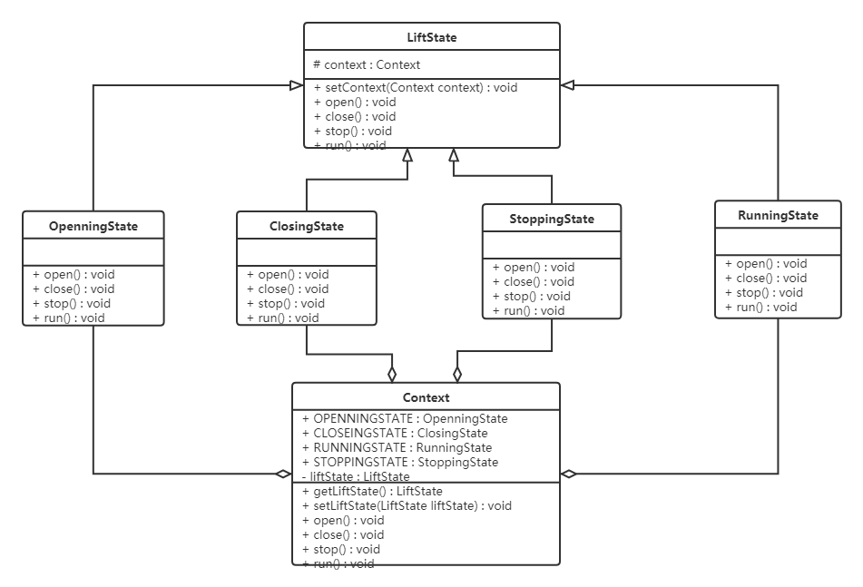 6.5.3 案例实现 对上述电梯的案例使用状态模式进行改进。类图如下:
