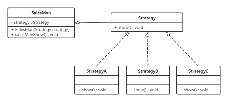 1 2 3 4 5 6 7 8 9 10 11 12 13 public class SalesMan { private Strategy strategy; public SalesMan (Strategy strategy) { this .strategy = strategy; } public void salesManShow () { strategy.show(); } }