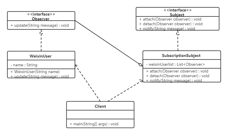 微信公众号是具体主题(具体被观察者),里面存储了订阅该公众号的微信用户,并实现了抽象主题中的方法