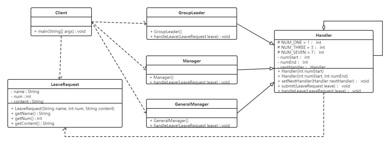 具体处理者(Concrete Handler)角色:实现抽象处理者的处理方法,判断能否处理本次请求,如果可以处理请求则处理,否则将该请求转给它的后继者。