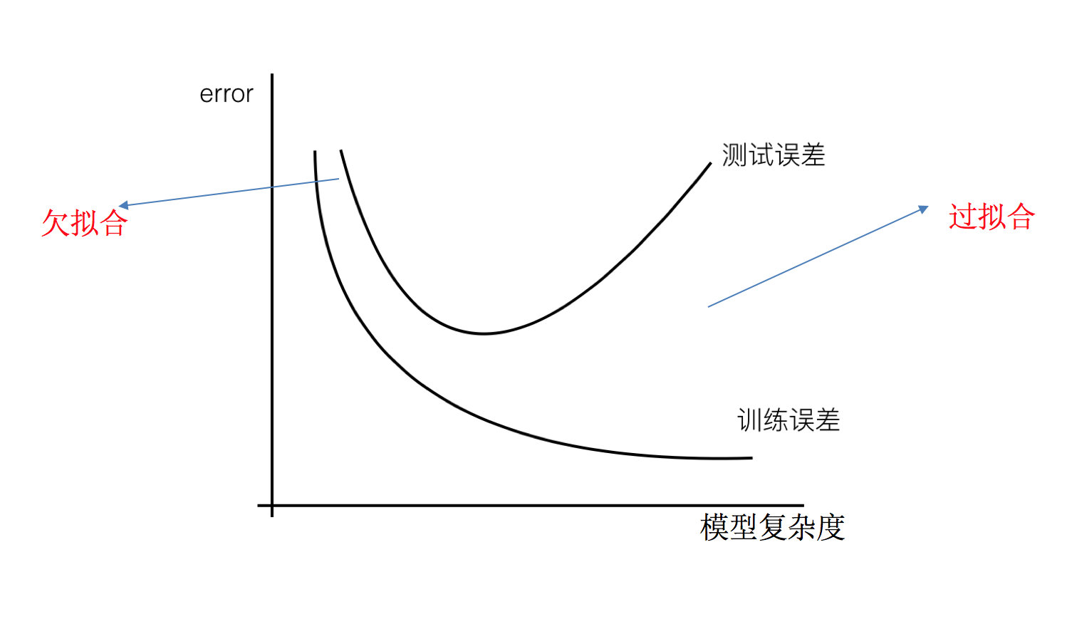 过拟合在训练集上误差较小,而测试集上误差较大